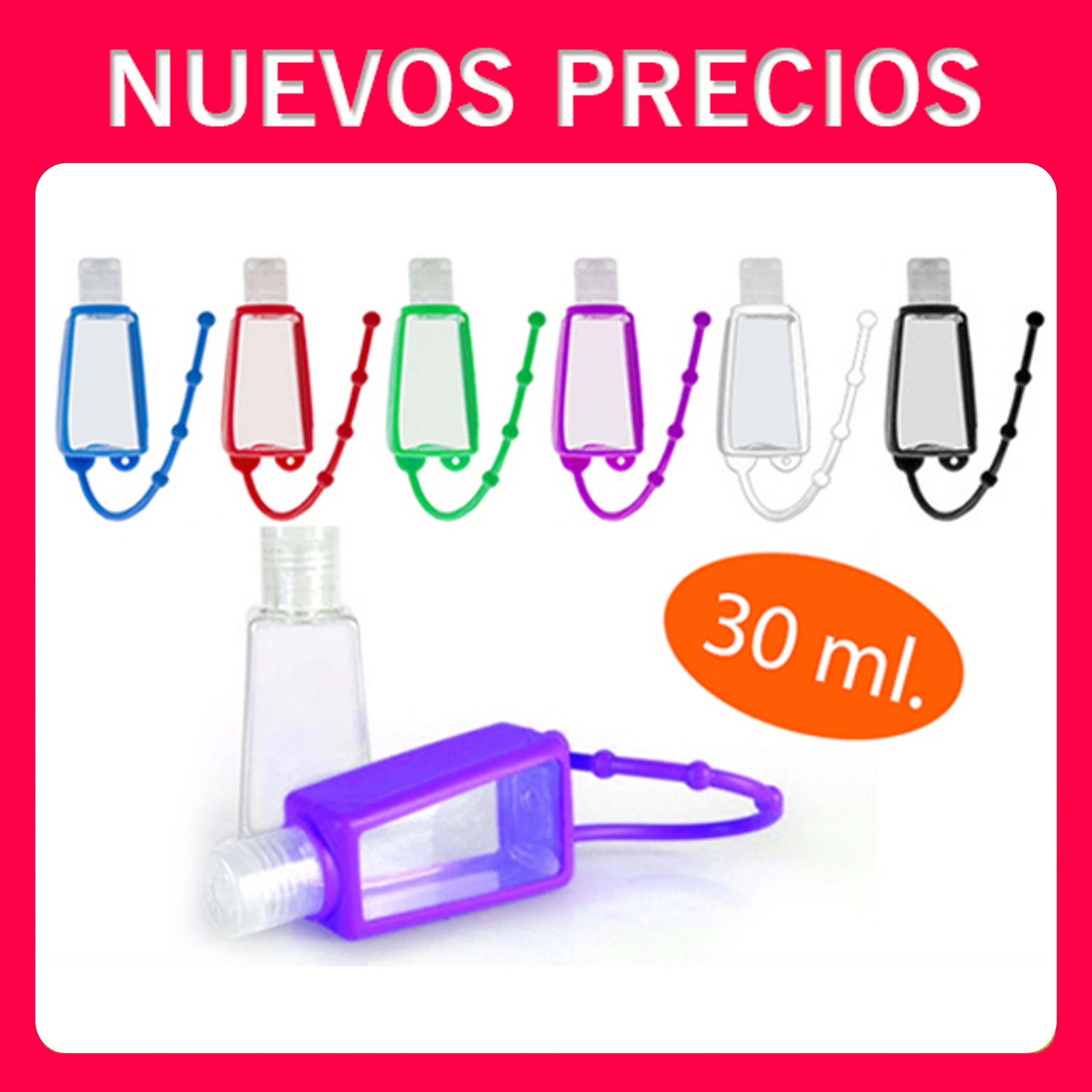 Envase de plástico duro con funda y cinta ajustable de silicona. Portátil para llevarlo en mochilas o carteras. Incluye alcohol gel.