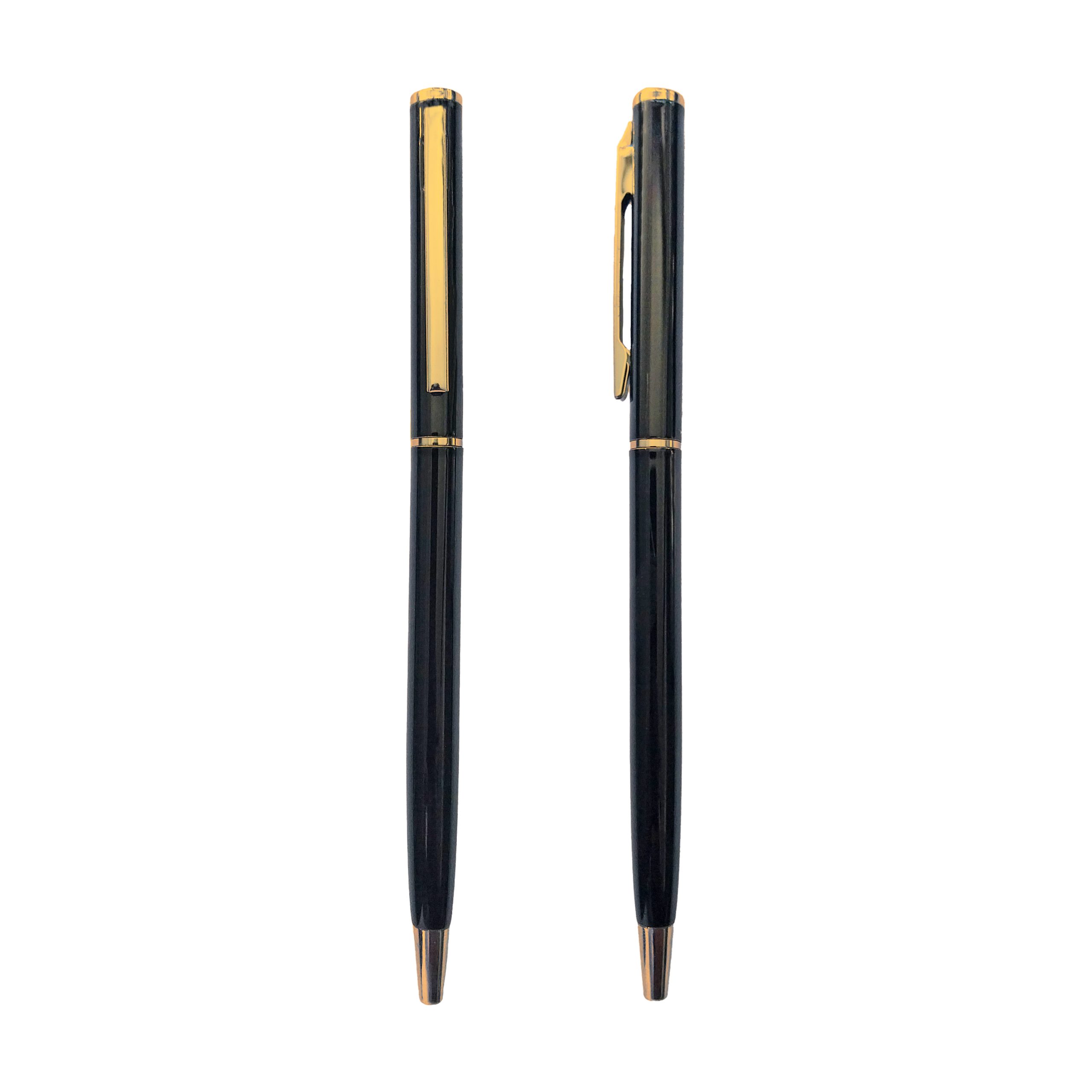 Bolígrafo metálico negro con detalles plateado o dorado.