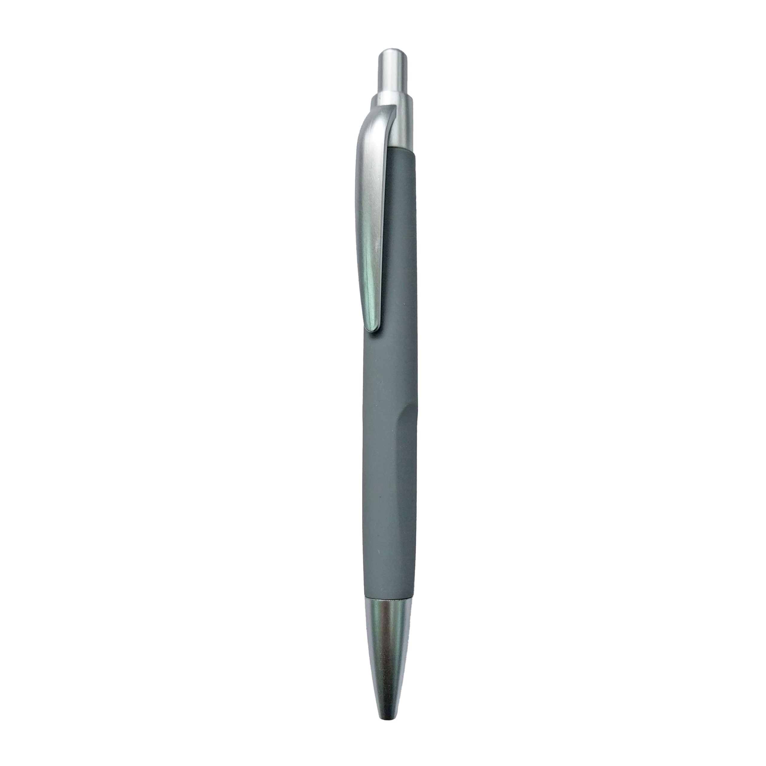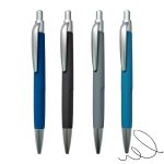 Bolígrafo plástico estilizado de apertura giratoria. Terminaciones en color plata.