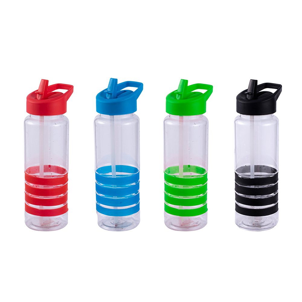 Vaso plástico blanco con tapa rosca y dosificador. Incluye goma antideslizante.