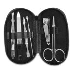 Set de Manicure plateado con funda símil cuero color negro. Incluye cortaúñas de manos y de pies, pinzas, tijeras, lima y utensilio.