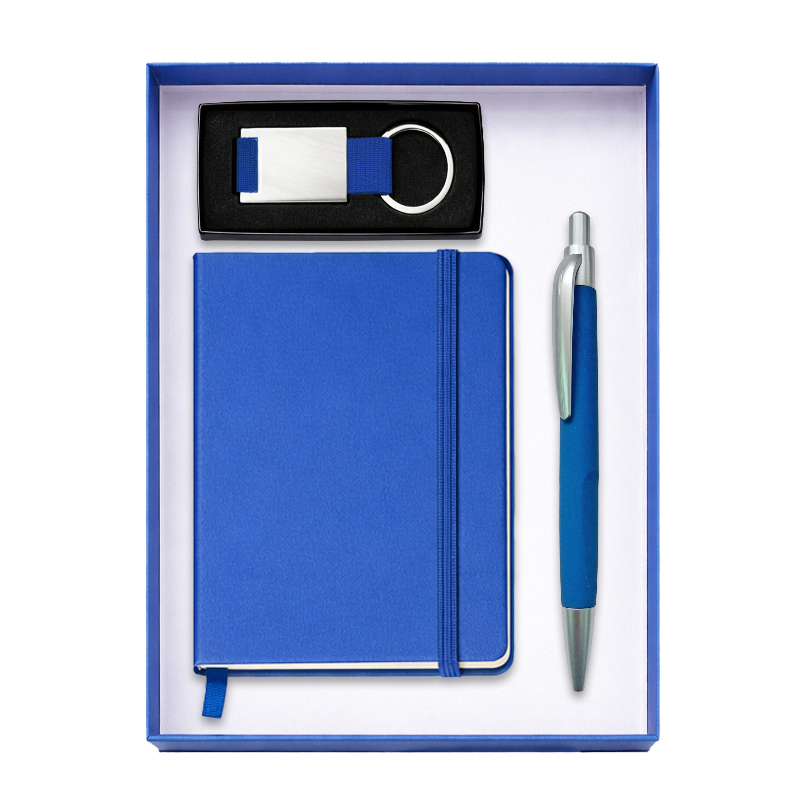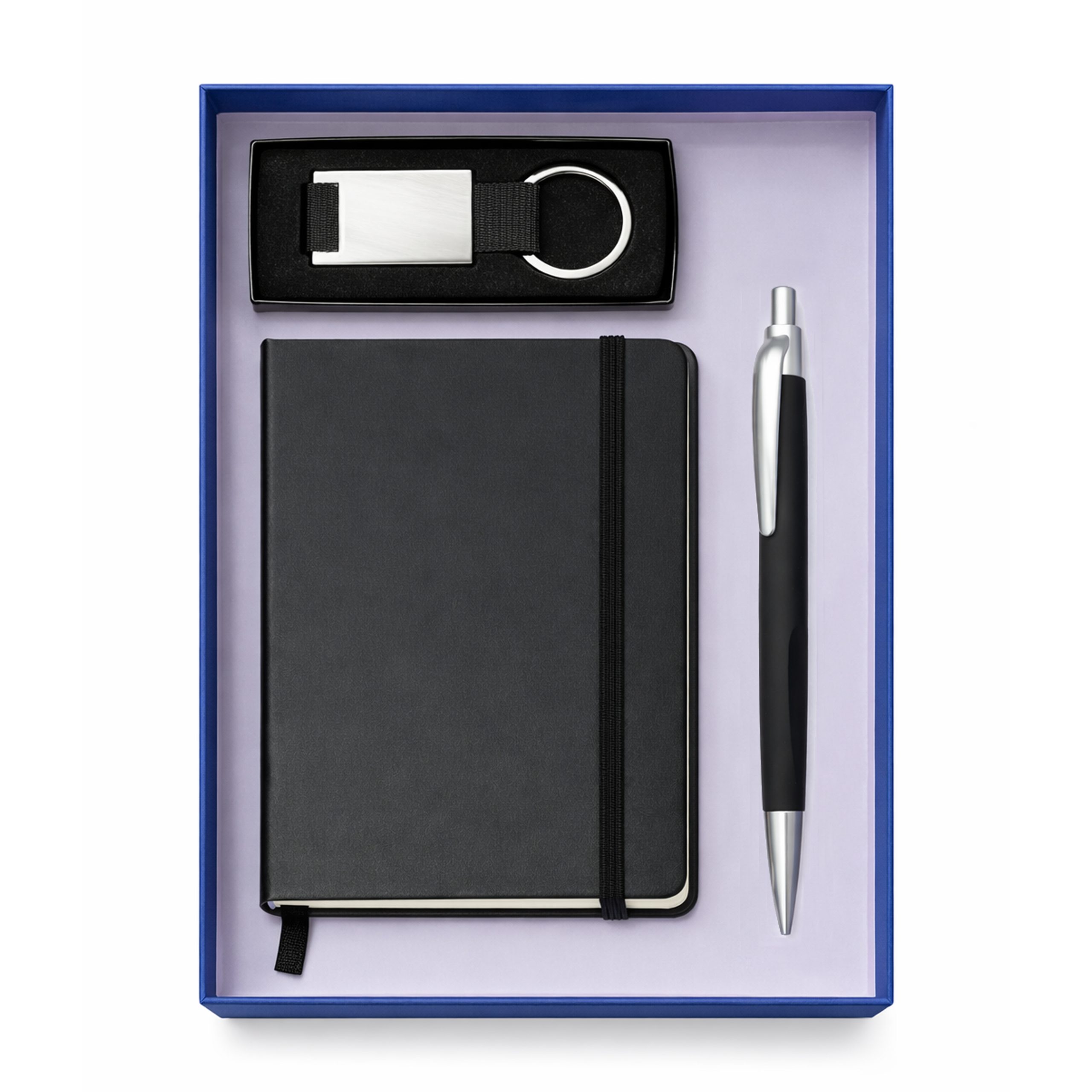 Set para regalo que incluye 1 bolígrafo L65, 1 libreta N33 y 1 llavero K29, todo dentro de 1 estuche VL157.