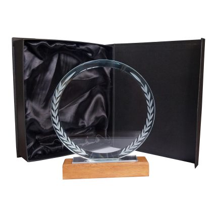 Cristal de 15mm. de espesor grabado en dos puntos con Base de Madera.